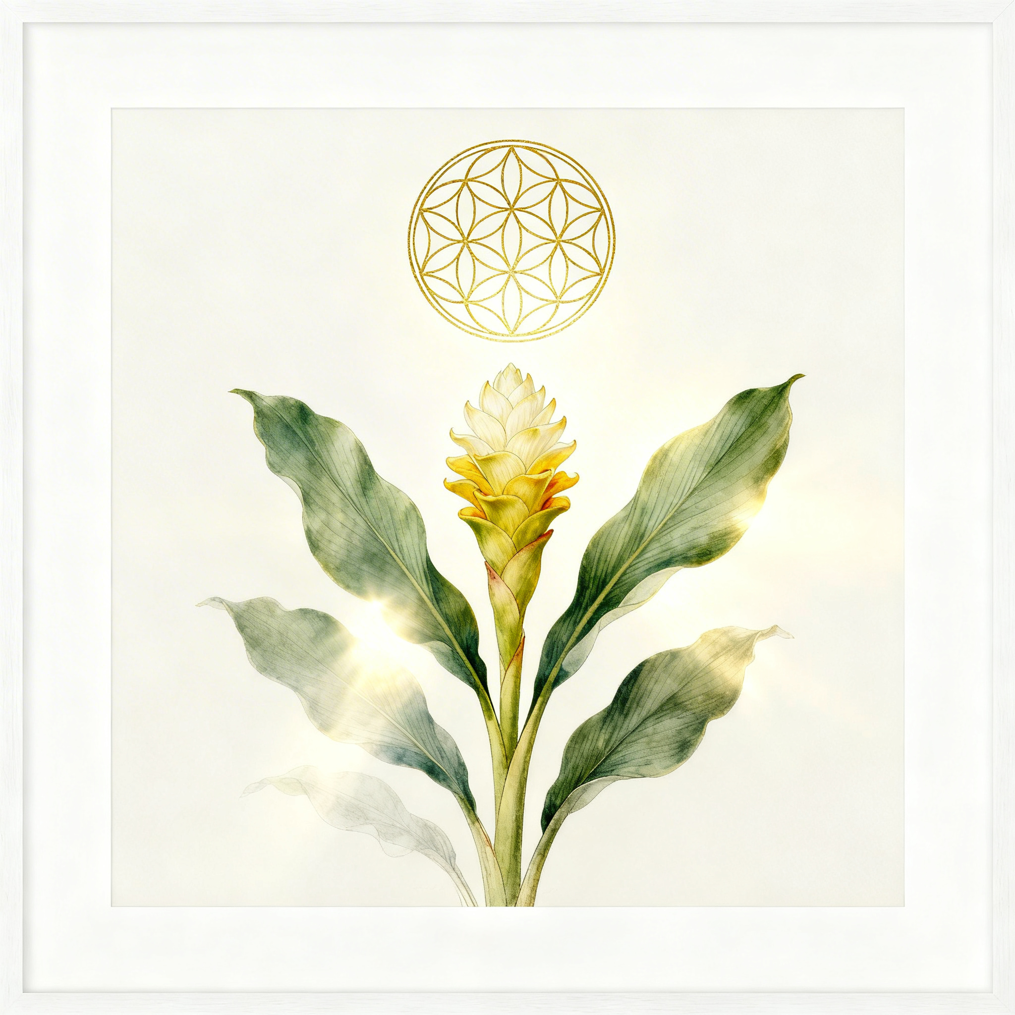 Dieses Wandbild vereint die vitale Strahlkraft der Kurkuma-Pflanze mit der zeitlosen Ordnung der „Blume des Lebens". Die feine, aquarellierte Ausarbeitung der Blätter fängt das Licht ein und symbolisiert das lebendige Wachstum, während die goldene Geometrie über der Blüte als Zeichen für universelle Harmonie und energetischen Schutz steht.